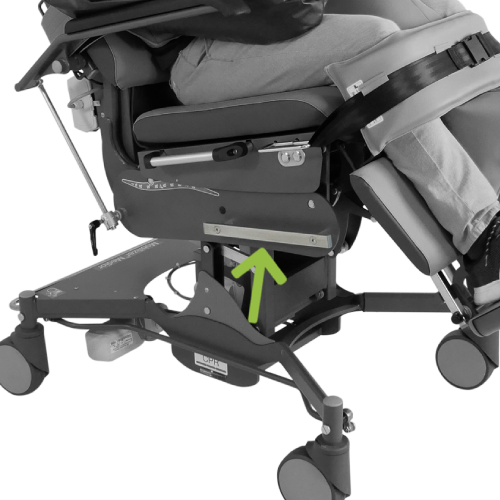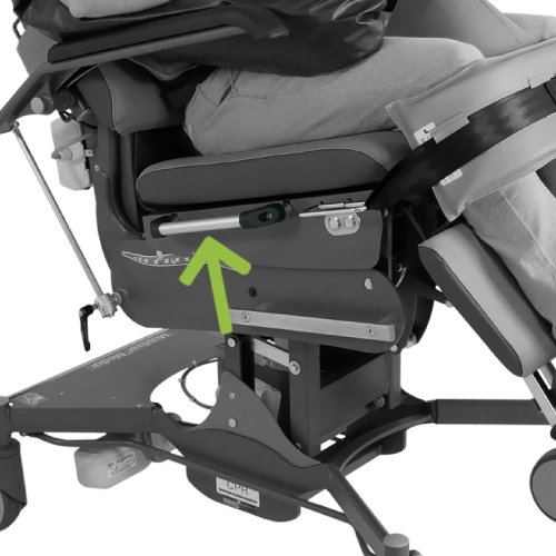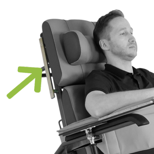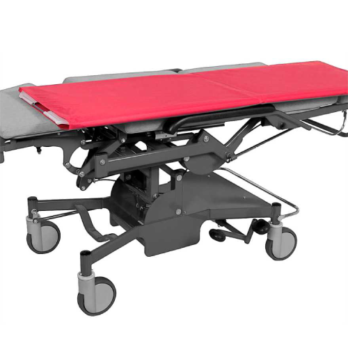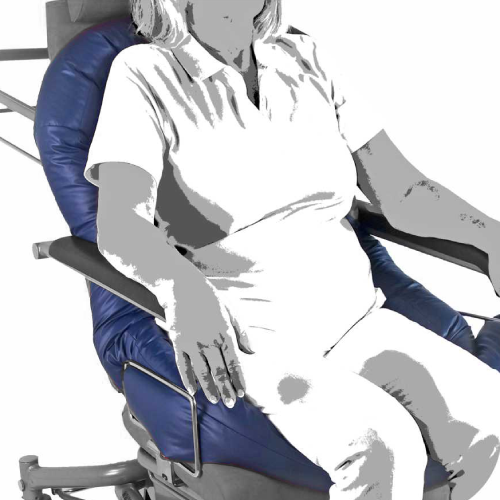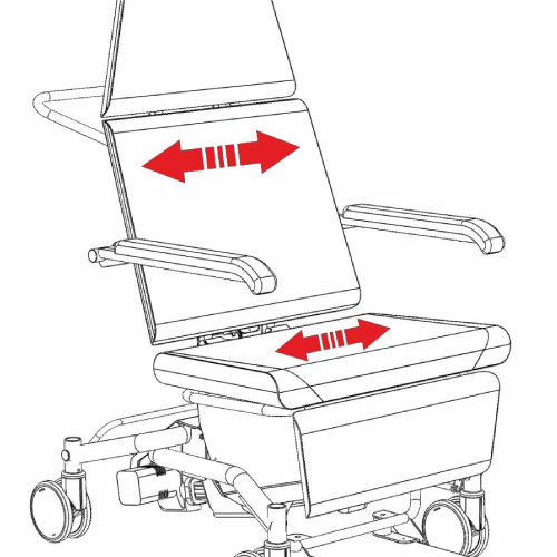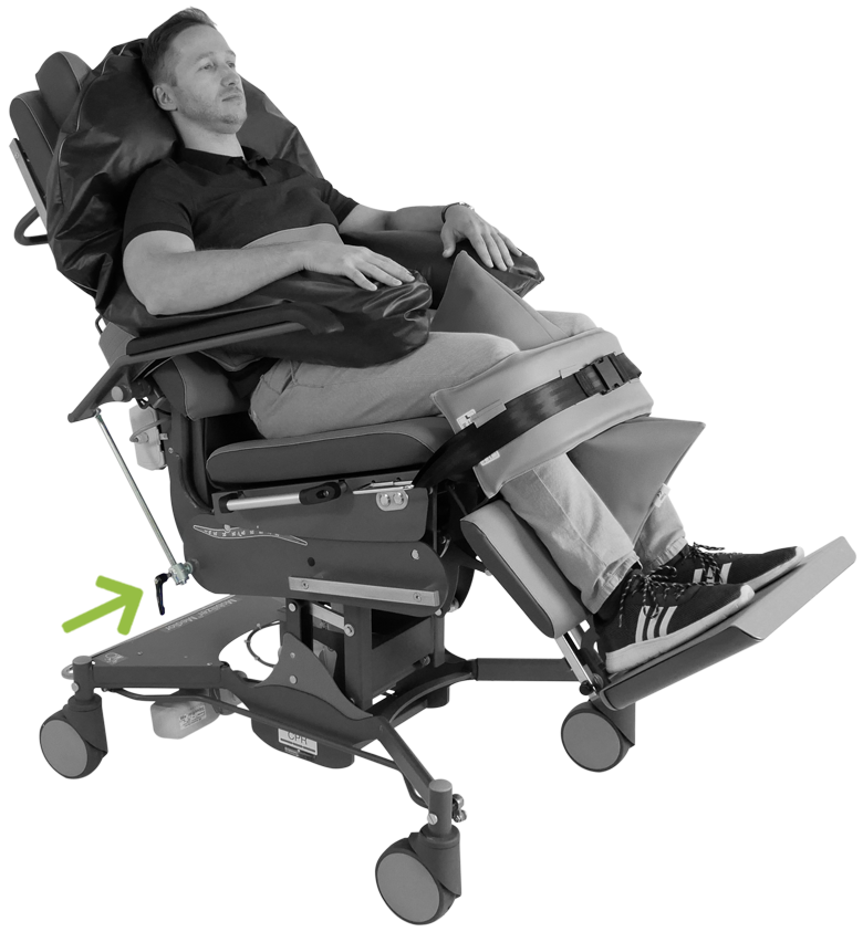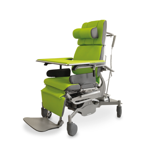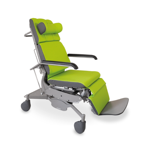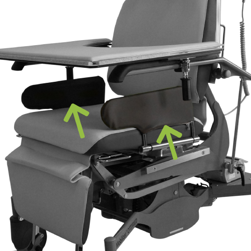 - Ein barrierefreier Patiententransfer mit einem Rollboard ist auch in einer „Rückenschräglage“ jederzeit möglich. Die Armlehnen und Seitenstabilisatoren können komplett weggeklappt werden.