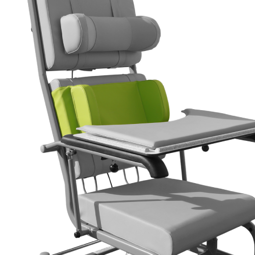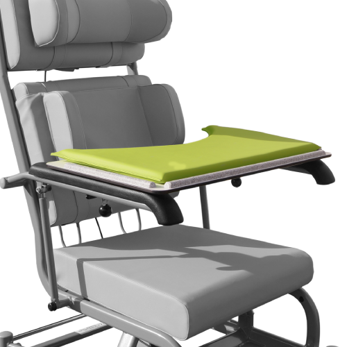 Ein Therapietisch mit gepolsterter Tischauflage gehört ebenso zu den Ausstattungsoptionen wie ein Infusionshalter, Pelotten für mehr Seitenhalt oder unterschiedliche Beinstützen und Lagerungspolster.